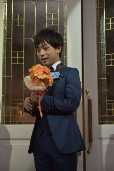 そしてその花束を持って階段をのぼり、扉をノック!!