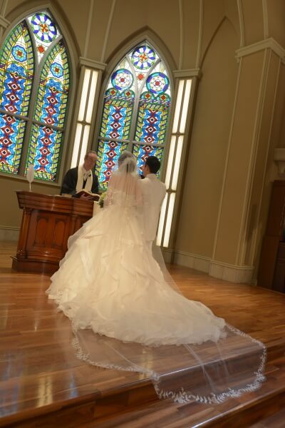 ドレスのトレーンが長く階段にもかかるため