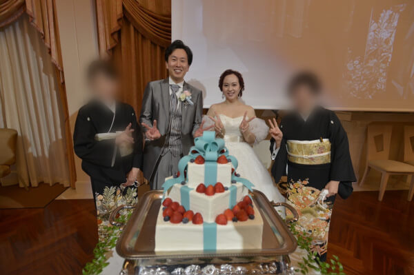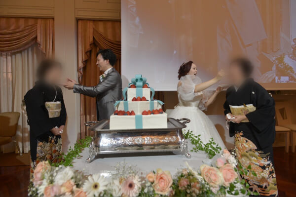 ケーキ入刀後は超特大スプーンでファーストバイト♬